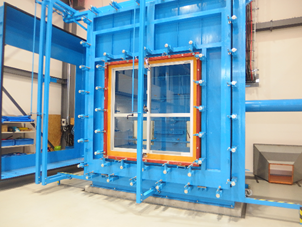 動風圧試験装置は、圧力箱、送風機、圧力調節器、圧力測定器などから構成されています。本装置では、試験体を圧力箱に取り付け、送風機によって発生させた風圧を、自動制御で試験体に加えます。本試験装置にて「気密性試験」「水密性試験」「耐風圧性試験」を行うことができます。圧力は室外側からの加圧(圧力箱内を加圧)を正圧、室内側からの加圧(圧力箱内を減圧)を負圧としております。